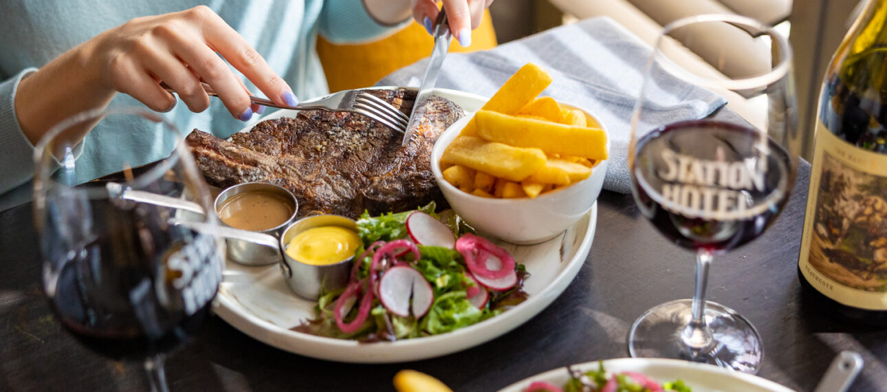 The Station Hotel has earned a reputation for serving the best steaks in the west. Premium, locally sourced steaks are elevated with classic cooking techniques, and a range of steak cuts and sizes ensures that there is something for every steak lover at The Station Hotel.